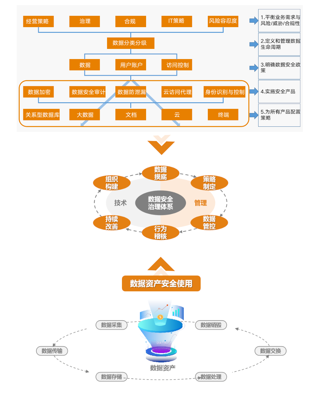 该方法论参考Gartner数据安全治理框架,形成适用于国内现状的数据安全治理体系,真正做到管理指导技术、技术支撑管理,管理和技术有机结合。从数据全生命周期进行分析梳理,以数据资产安全合理使用基础,形成数据安全治理体系。