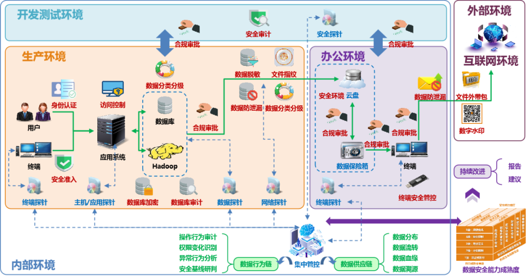 系统控制阶段,基于数据全生命周期定义不同分级的数据基本控制策略,制定对敏感数据的检测规则,建立数据防泄漏保护管理规范及流程,以及对分类规则进行测试及迭代优化。