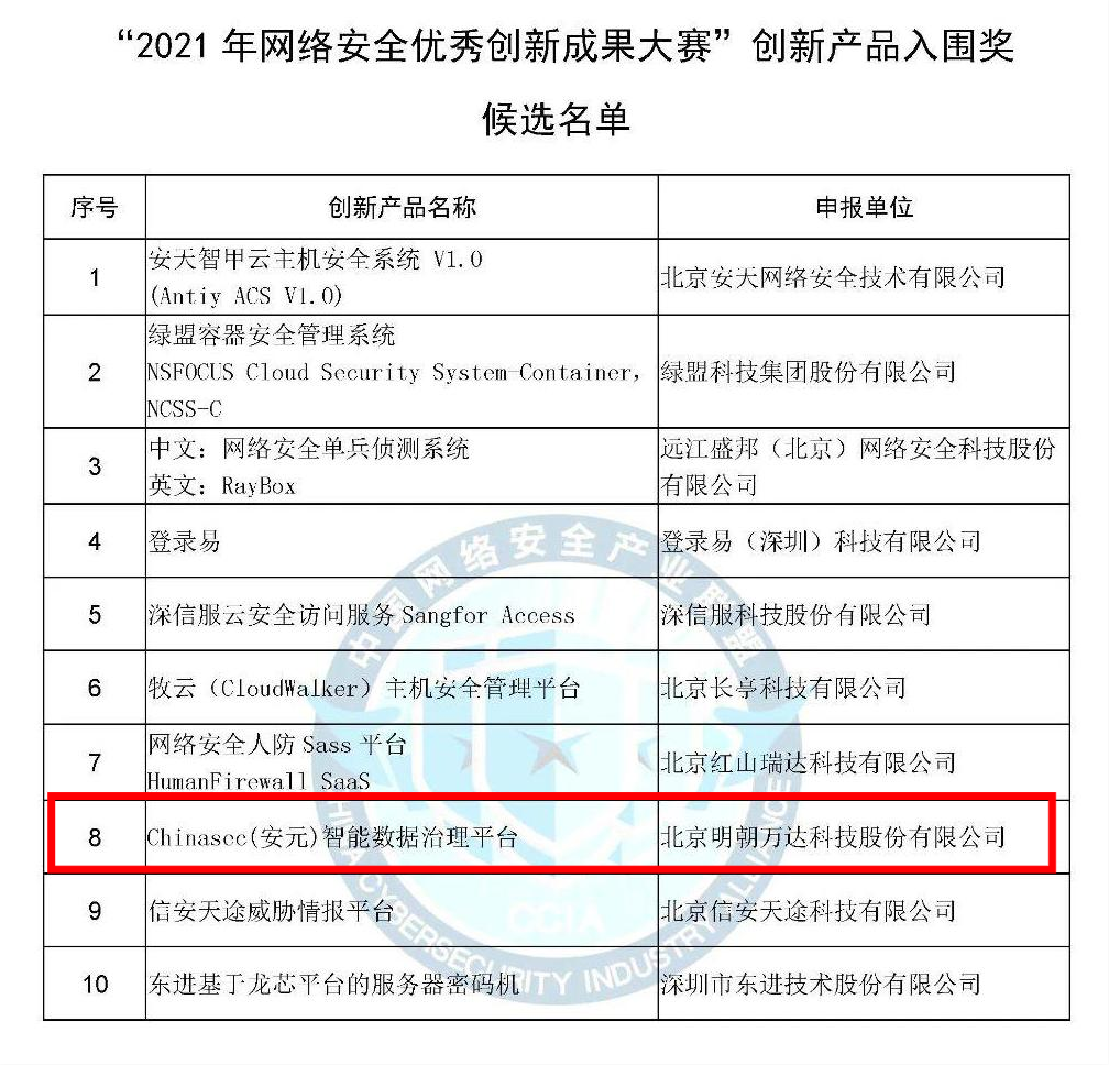 经评审专家组严格评审,明朝万达“Chinasec(安元)智能数据治理平台”获得了本届大赛“2021年网络安全优秀创新成果大赛”创新产品入围奖。