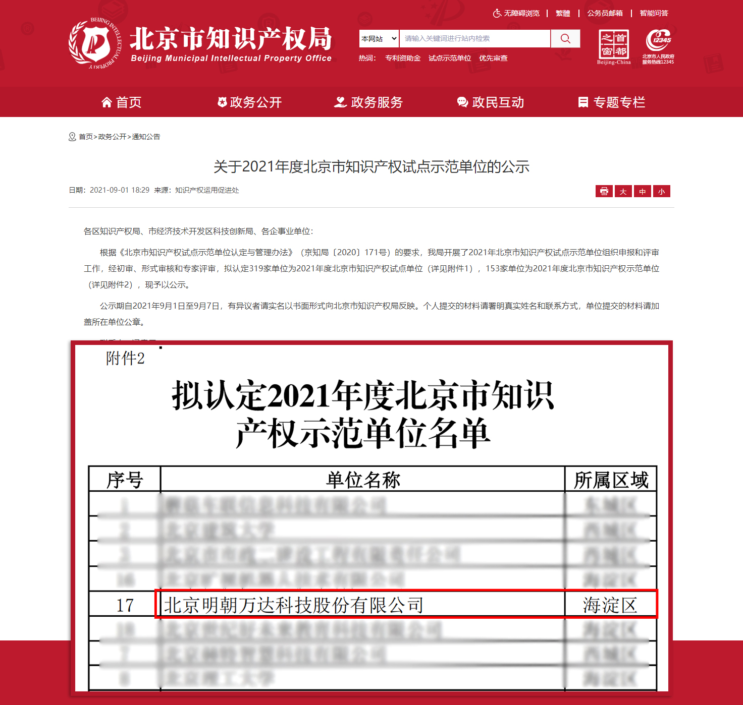 近日,北京市知识产权局发布了“2021年度北京市知识产权试点示范单位名单”。其中,北京明朝万达科技股份有限公司(以下简称“明朝万达”)凭借强大的技术创新能力,以及在知识产权保护、运用层面的卓越表现,经严格评审,被认定为“2021年北京市知识产权示范单位”。