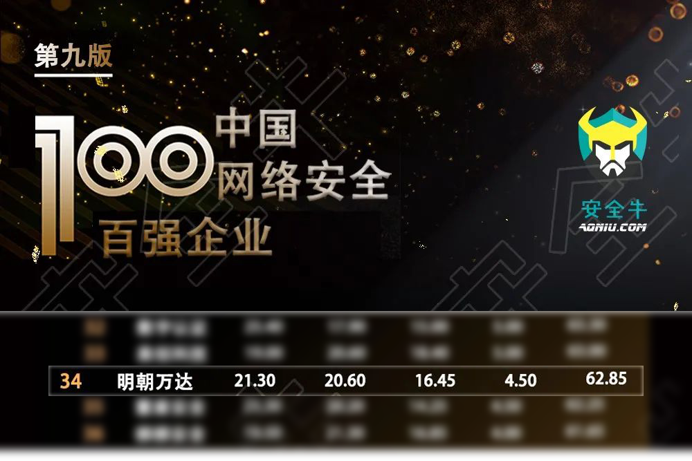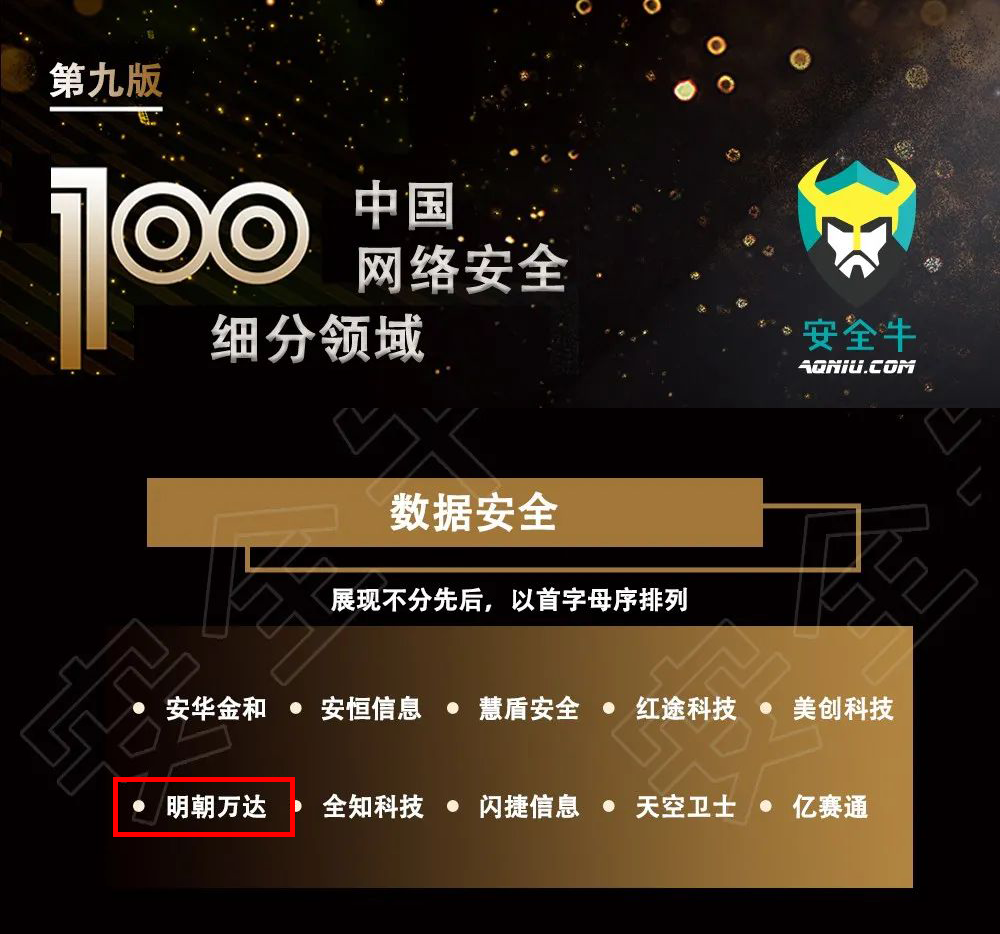 今日,国内权威安全媒体“安全牛”发布了《中国网络安全企业100强》(第九版)。明朝万达凭借在数据安全领域的卓越表现入选中国网络安全企业100强。