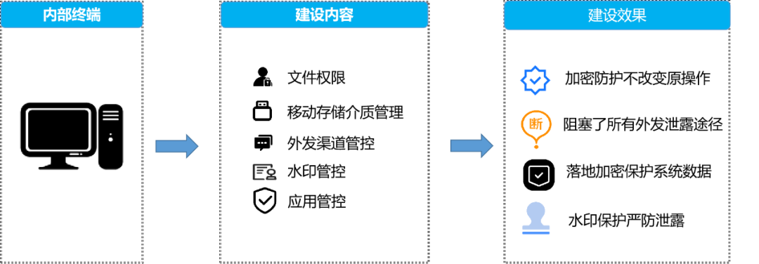 其中,终端数据防泄漏平台通过监测终端设备的网络流量运行的软件USB接口等实时发现发送、上传、拷贝、转移数据文件等行为,扫描文件是否包含禁提供或披露的数据进而实时告警或阻断;网络防泄漏平台则能够实时监测通过HTTP、HTTPS进行外发的各项内容,对敏感、高密级的内容进行相应的审计、阻断、审批等防护手段,可以有效防范内部人员窃取、泄漏数据的风险同时有助于安全事件发生后的溯源取证。