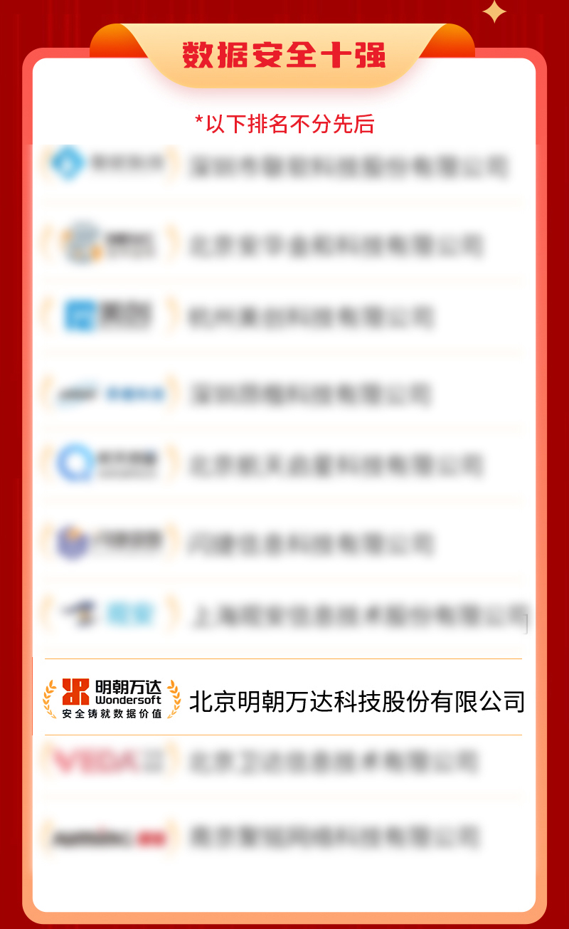 近日,由等级保护测评主办的“2021年网络安全优秀企业及产品评选活动”圆满结束,历经专家初评、网安用户线上投票、专家组终评三个环节,正式公布优秀企业及产品名单。其中,明朝万达凭借对数据安全领域的深入研究和实践,卓越的产品技术实力,以及领先的市场竞争力,获评“数据安全十强”奖项。