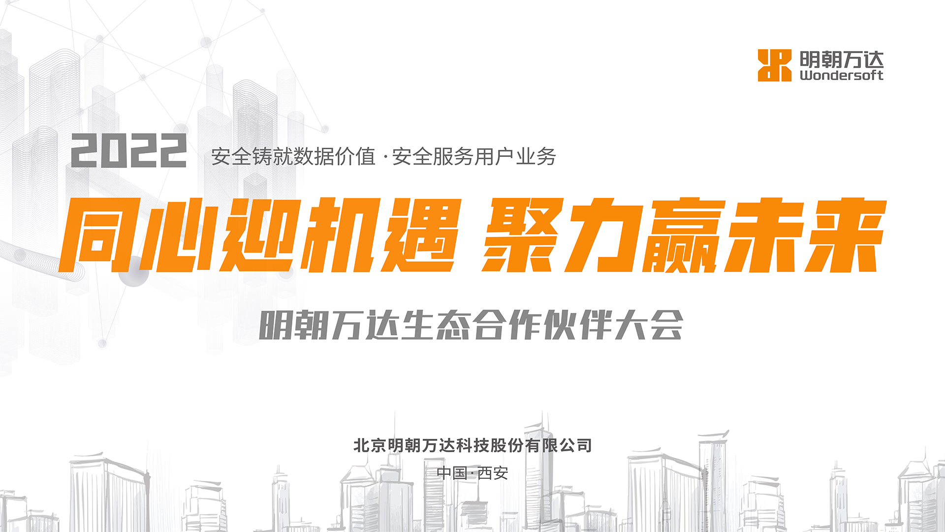 7月28日,由北京明朝万达科技股份有限公司主办的“ 同心迎机遇·聚力赢未来丨明朝万达2022年渠道生态合作伙伴大会-西安站 ” 成功举办,此次会议得到了西安软件园发展中心的大力支持,并有200余家渠道合作伙伴共同参与。会议围绕数字经济发展、数据安全市场现状、渠道生态理念等内容进行介绍,旨在与合作伙伴共同探讨数据安全市场发展和机遇,进一步加强合作“深度融合,携手共赢”。