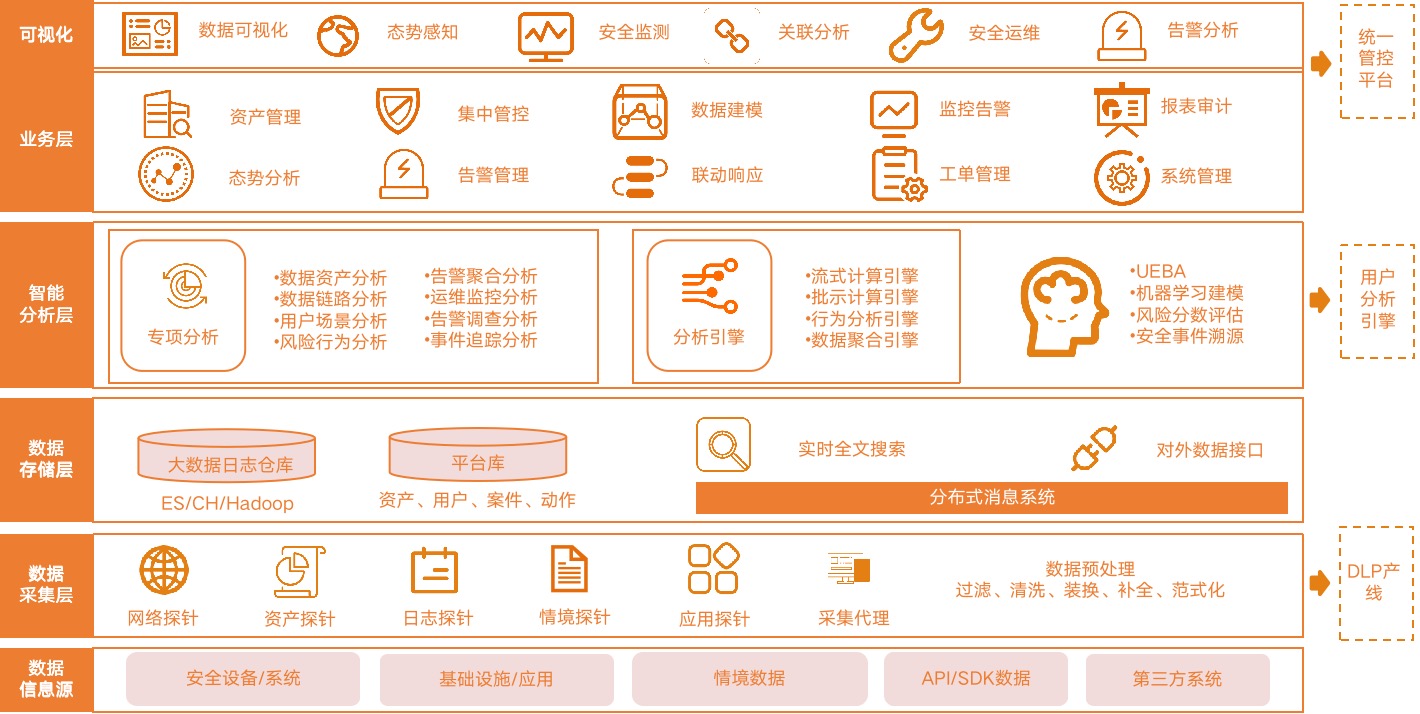 明朝万达敏感数据流转监测和文件溯源解决方案采用了明朝万达自主研发的数据安全系列产品,主要包括DLP系统、行为分析引擎、统一管控平台。DLP系统主要对数据进行采集、解析、扫描和打标等处置,同时利用行为分析引擎对数据进行智能分析,识别安全风险,以便联动进行响应处置,通过统一管控平台实现对全业务流程的数据安全管理。