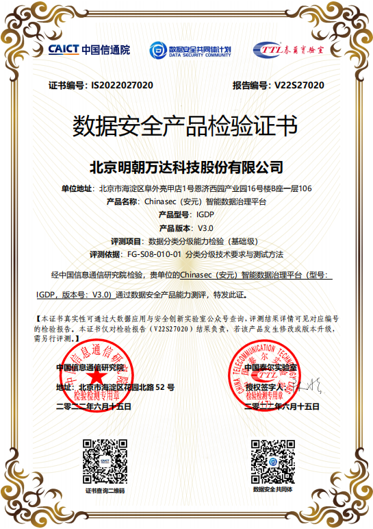 该证书是中国信通院数据安全产品检验最高级别的认证。《数据安全法》明确规定应建立数据分类分级保护制度,对数据实行分类分级保护。此次明朝万达数据分类分级能力通过权威测评,充分体现明朝万达数据安全产品内核技术的先进性与创新性,功能完备成熟,符合并遵循数据安全标准规范,在满足用户数据安全建设的同时为实际业务需求提供可靠保障。