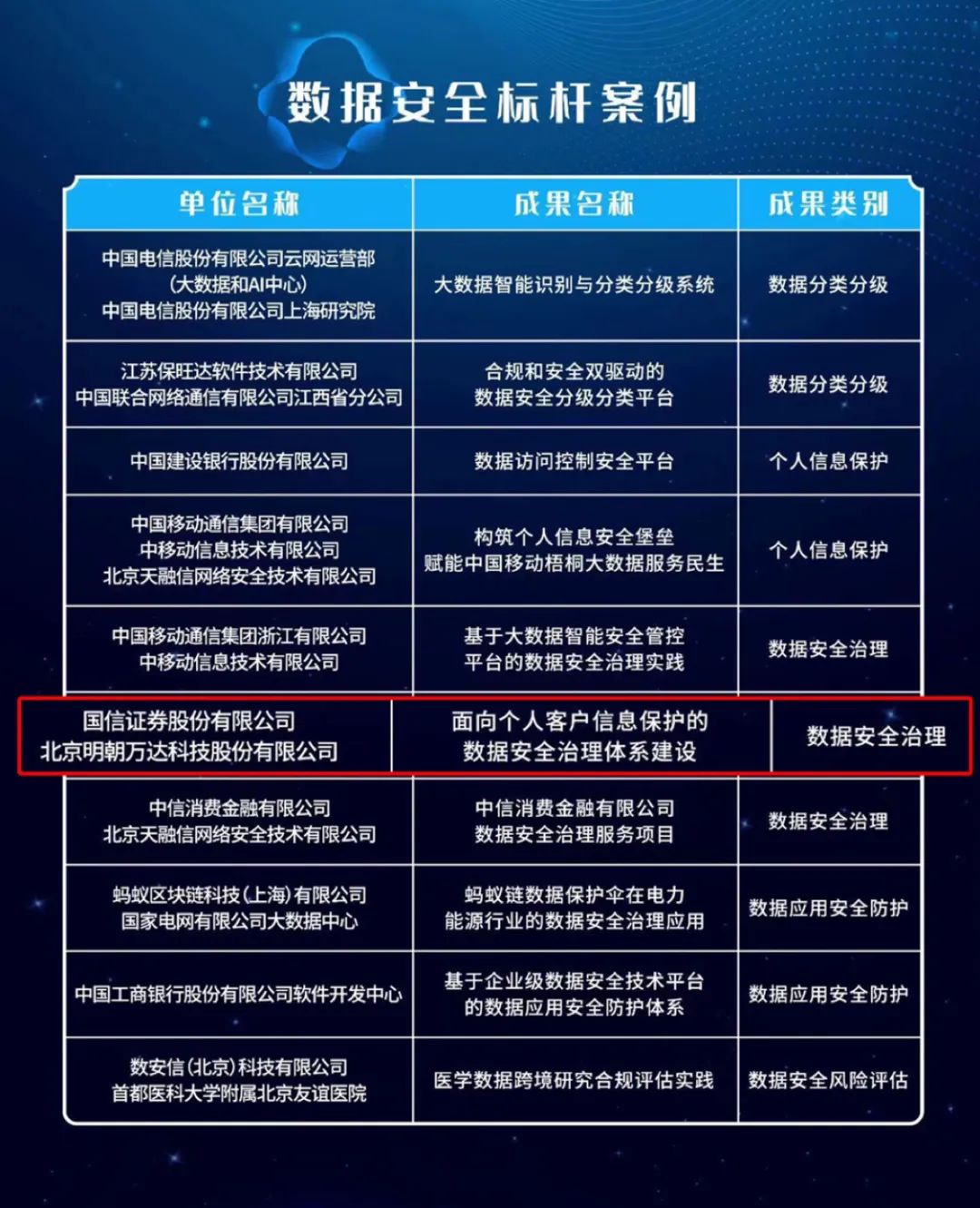 其中,由国信证券股份有限公司(以下简称“国信证券”)和北京明朝万达科技股份有限公司(以下简称“明朝万达”)共同完成的“面向个人客户信息保护的数据安全治理体系建设”方案经过层层审查和专家评审,被评选为【数据安全标杆案例】。