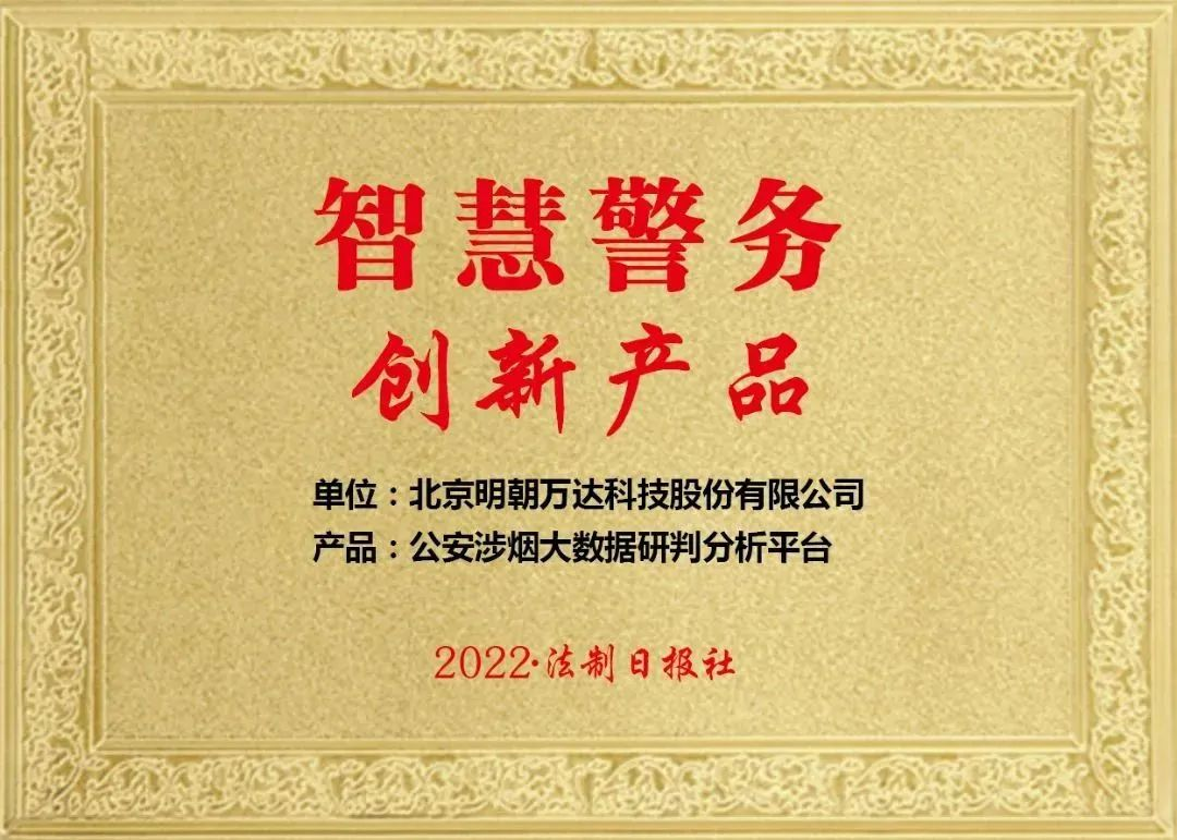 近日,法治日报官方微信公布了2022政法智能化建设创新案例和论文征集宣传活动结果,北京明朝万达科技股份有限公司的 “公安涉烟大数据研判分析平台” 获评【智慧警务创新产品】。